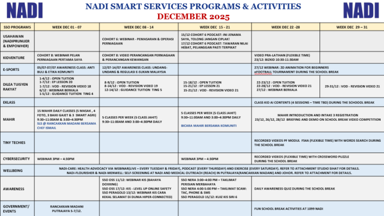 TARIKH 22-29 DISEMBER 2026 MASA 9.30AM -4.30PM LOKASI NADI KAMPUNG AWAH TUJUAN Aktiviti Fun Break telah diadakan di NADI Kampung Awah bagi mengisi masa lapang kanak-kanak sempena cuti sekolah. Program ini bertujuan untuk memberi ruang kepada kanak-kanak mengekspresikan kreativiti dalam […]