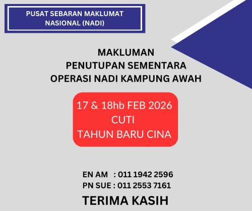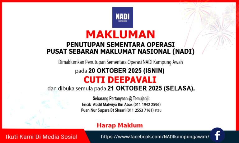 NOTIS PENUTUPANUntuk makluman,penutupan sementara operasi NADI Kampung Awah pada 20 October 2025 (Isnin) bersempena dengan CUTI UMUM (Hari Deepavali).dan akan kembali beroperasi seperti biasa pada hari 21 Oktober 2025 (Selasa)Sekian, harap maklum.